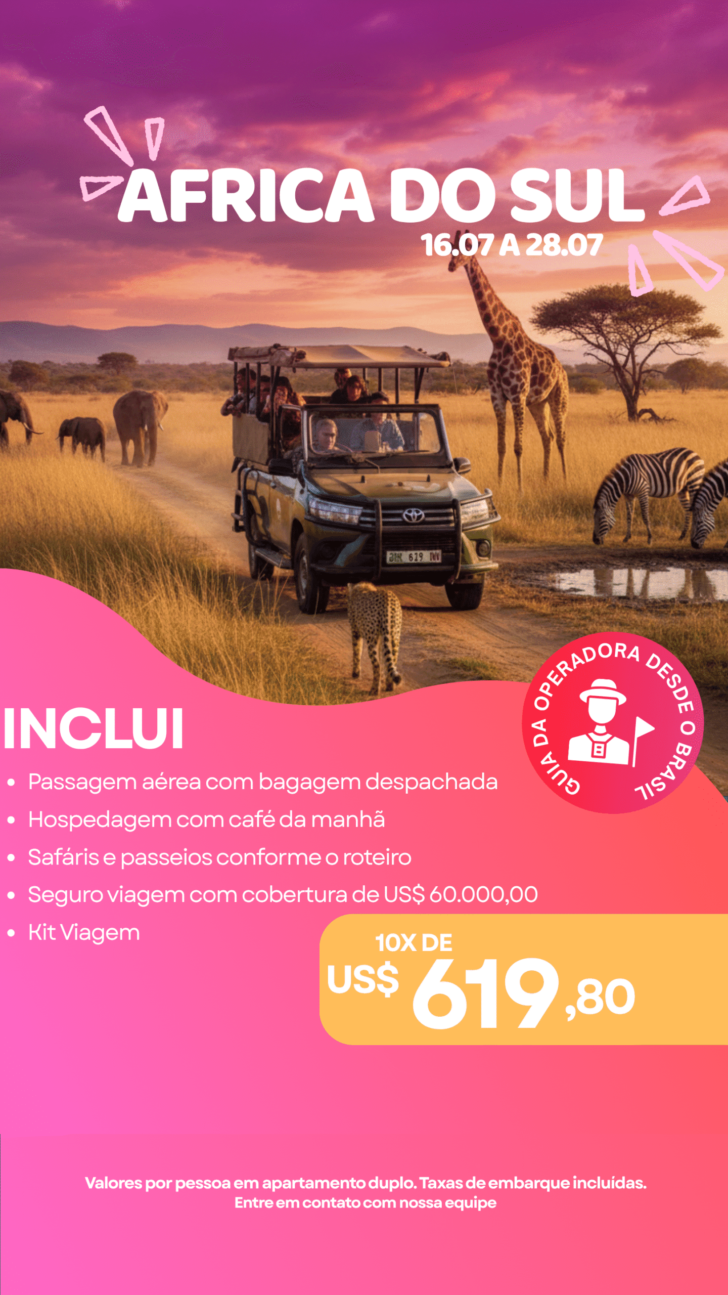 Em horário determinado, encontro com nosso guia em aeroporto Salgado Filho de Porto Alegre, embarque em seu voo de conexão, com destino a Johanesburgo e conexão em São Paulo/Guarulhos.