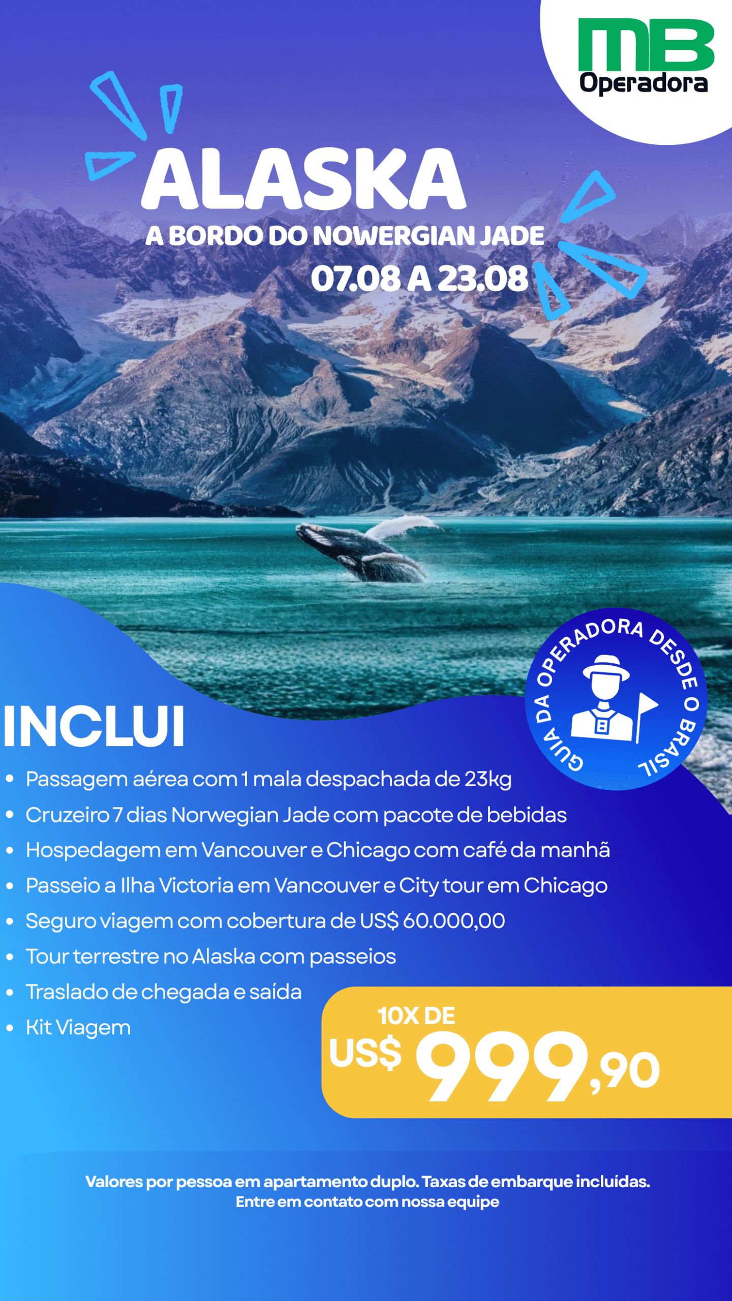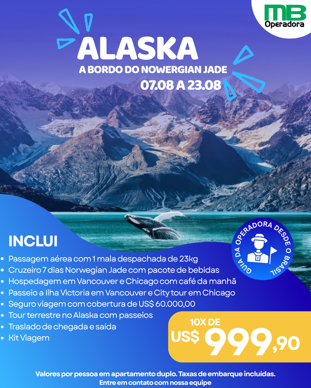 Café da manhã a bordo. As 07:00 chegada a cidade de Skagway. A pequenina Skagway é uma das paradas prediletas dos navios de cruzeiro. Não só pela beleza de seus encantadores jardins e por localizar-se no sopé das Montanhas Costeiras, como também por ter sido, no final do século 19, o ponto de partida de garimpeiros para a célebre Corrida do Ouro do Klondike em direção ao Yukon. Passear pelos quarteirões da Broadway Street com seus edifícios históricos é ser transportado de volta no tempo. O passeio de trem pela histórica Ferrovia White Pass & Yukon Route admirando cenários espetaculares das montanhas do Alasca e Canadá, além de caminhadas, passeios de barco, pesca e observação da vida selvagem são os destaques do que se pode fazer a partir deste porto. Saída do navio as 17:00. Jantar a bordo
