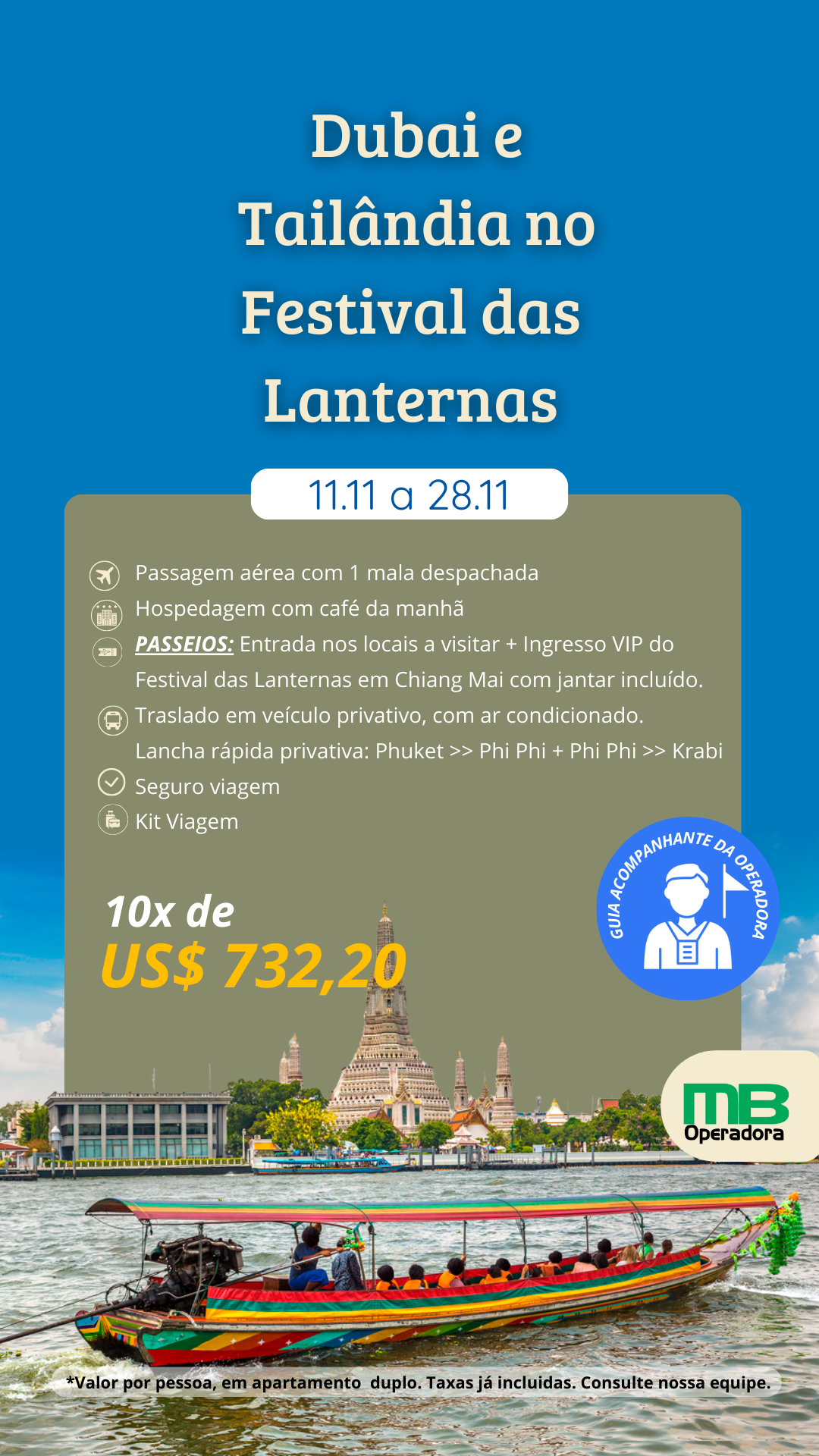 Café da manhã. Traslado de lancha rápida privativa para o porto de Phi Phi >> porto de Krabi. Traslado para o porto de Krabi >> aeroporto de Krabi. Chegada em Chiang Mai. Recepção e traslado ao hotel. Tempo livre e hospedagem.